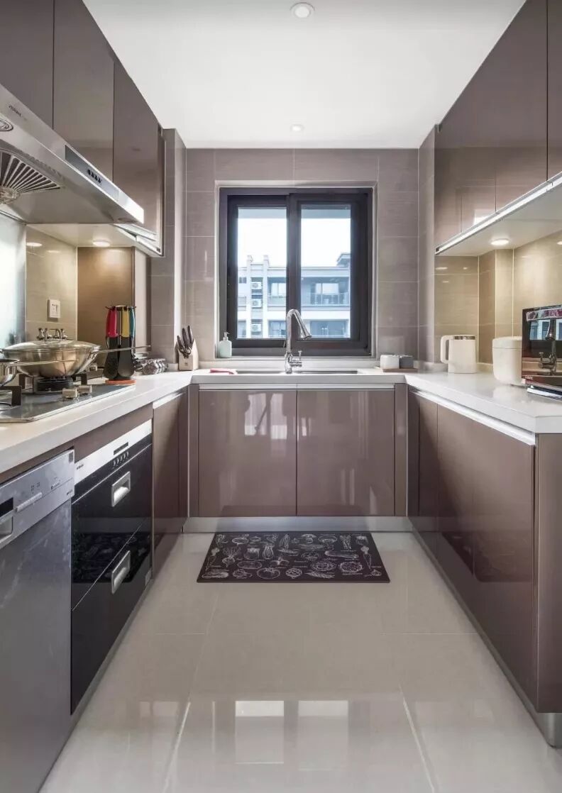 “U”字形布局最大的好处是可以把整个厨房都利用上。到顶吊柜极大地扩充了空间,下拉式置物篮能让用户轻松拿到高处的东西;地柜容量非常大,使得台面更加整洁;洗碗池正好做在窗口,最大程度保障了采光。