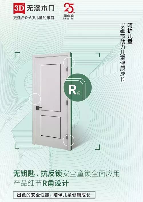还有一点我很喜欢,那就是3D无漆木门的细节十分到位,无钥匙、抗反锁,而且所有的边角都采用“R”角设计,最大程度上防止儿童被撞伤、磕伤,呵护孩子的安全。