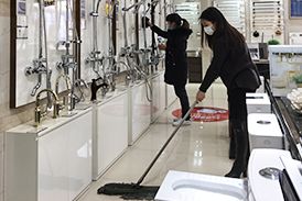 营业员正在仔细进行地面和展品的清洁、消毒。