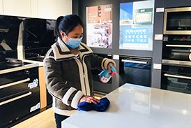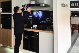 顾客离开后,细心的商家正在用酒精擦拭烟机按键。