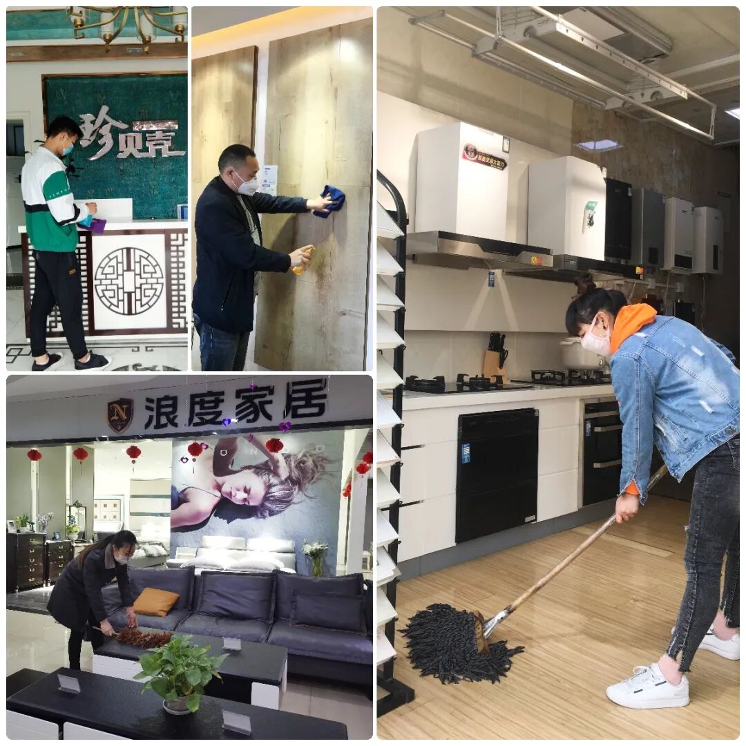 各门店商家、店员齐上阵,对地面、产品表面、玻璃门、广告牌、接待台、洽谈桌等顾客常接触面进行了重点清洁和消杀。