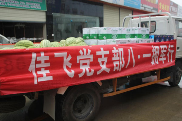2014年8月1日,是中国人民解放军建军87周年的节日,佳飞党支部组织慰问团,来到青白江消防大队开展“八一”拥军慰问活动,为青白江消防大队的全体指战官兵带去了夏季防暑降温的饮料及水果。