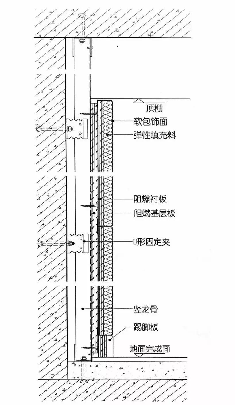 软包并不是简单的把材料往墙上贴,而是由饰面、填充料、阻燃板、阻燃基层、固定夹、竖龙骨等六层材料构成。
