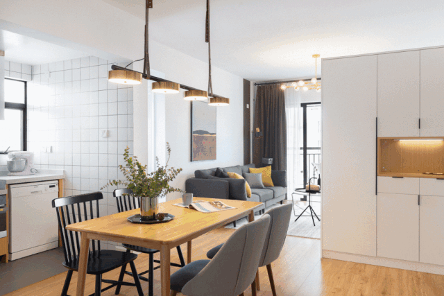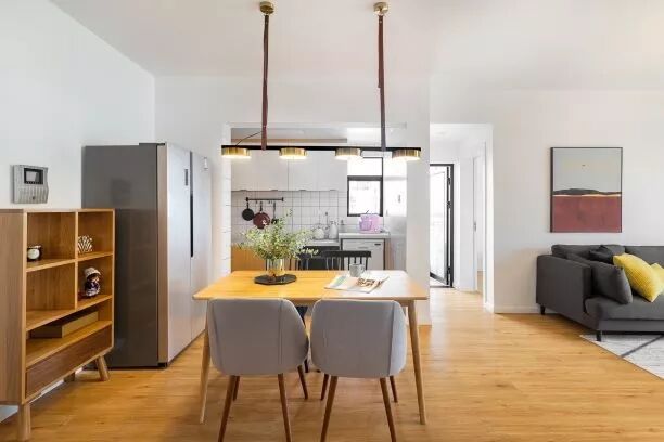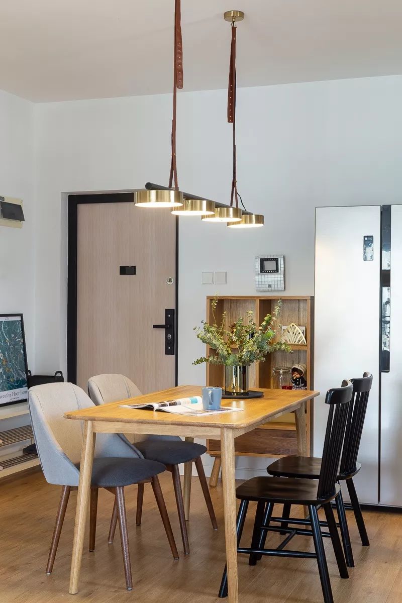 餐厅和厨房贯通,新砌了70cm的短墙,将冰箱与餐边柜移到外面,使用更方便,也能满足多人聚餐的需求。