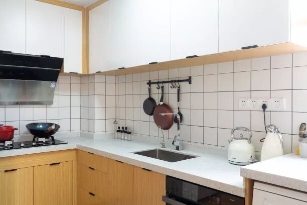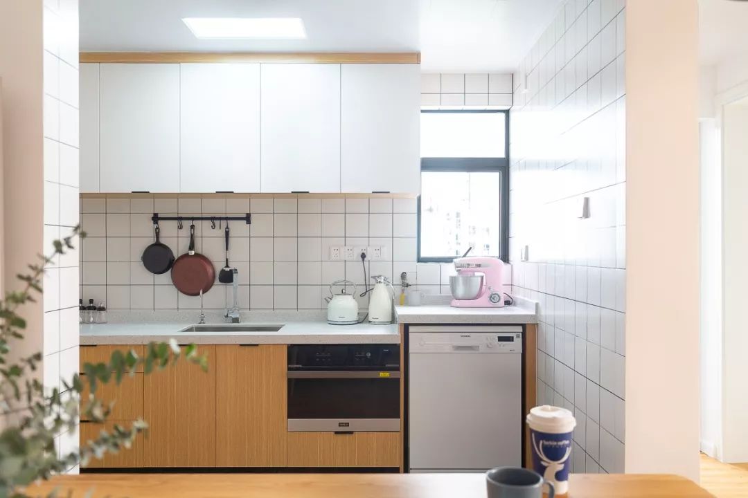 清新白格砖+橡木色橱柜,整个厨房干净、整洁、明亮。