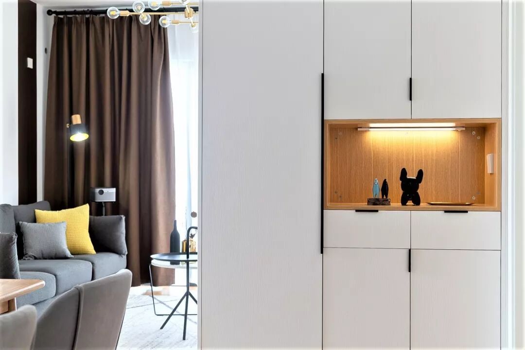 玄关设置感应灯带,晚上加班回家打开门,会自动感应,在漆黑的夜晚给到家的温暖。外套,包包可以挂在柜子里,满足即时收纳要求。