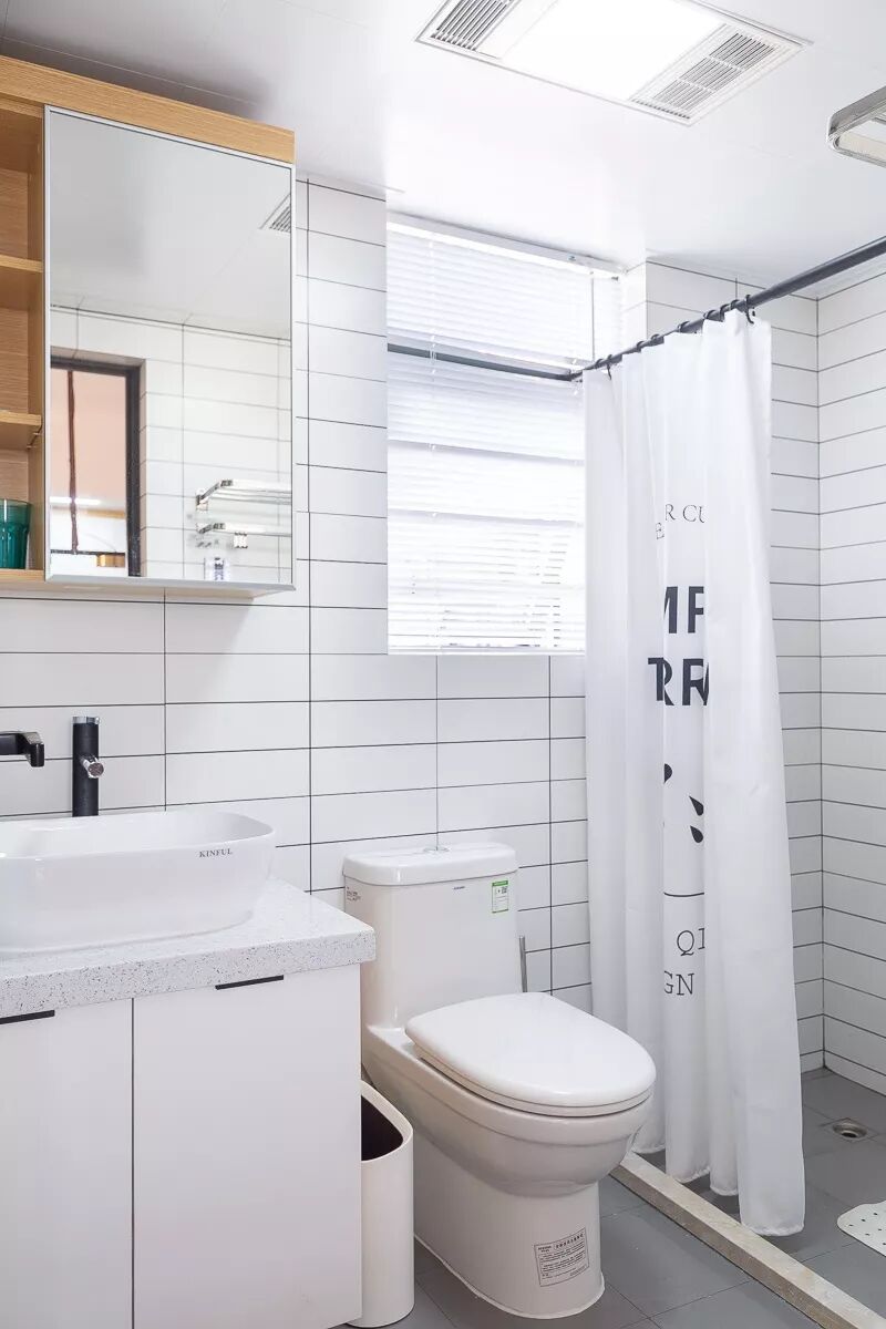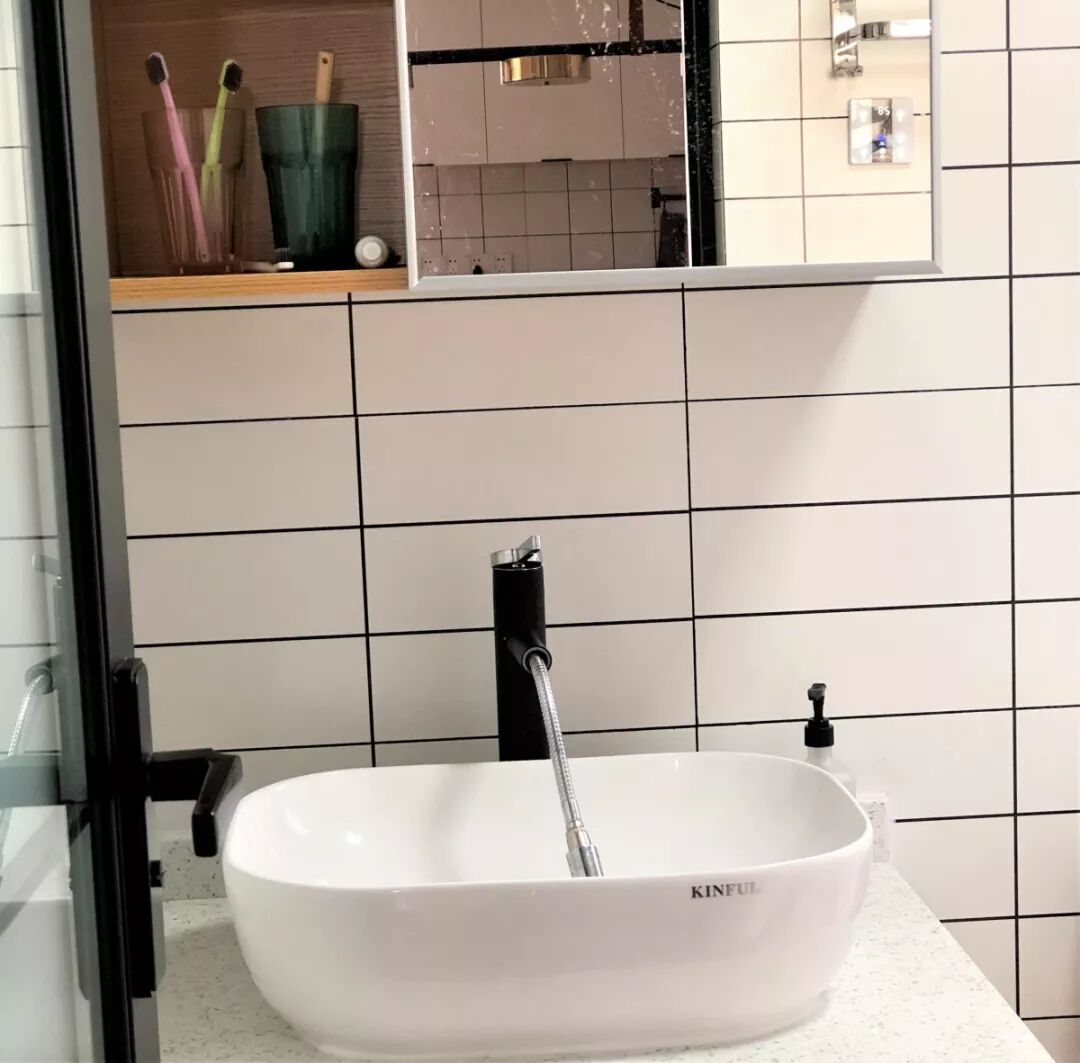 实用型卫生间,利用镜柜增加收纳,旁边的开放柜格,随手放放护肤品、口杯等。