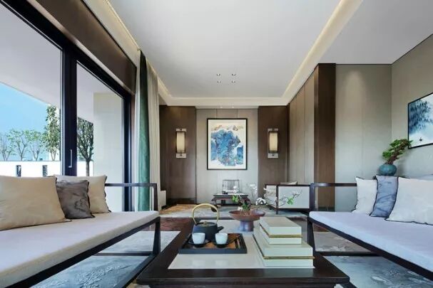 客厅墙面没有电视机,取而代之的是一幅幅山水挂画,大量出现的石青石绿画卷与窗外的园林形成呼应,让人仿佛身处大自然的环绕之中。