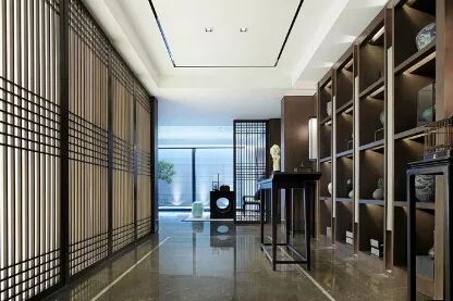 有别于传统新中式家装普遍采用的木地板,贺先生为家里铺设的是深色大理石地面,穿过客厅后一个转角,站在通道前端顿感天地乎变。