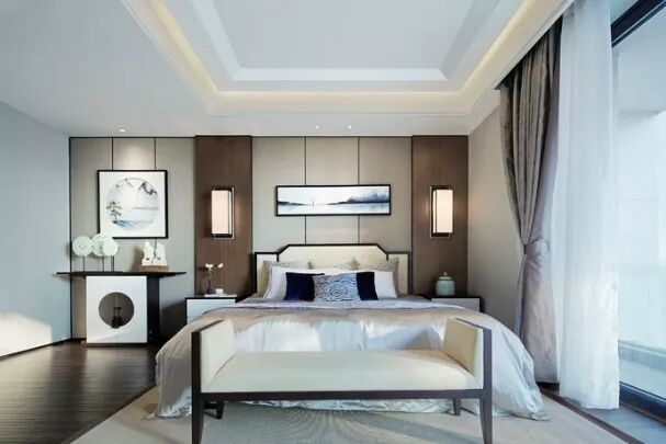 卧室除了新中式定制家具外采用了大面积留白,山水挂画简单点缀让卧室呈现出“蝉噪林逾静,鸟鸣山更幽”的清幽质感。