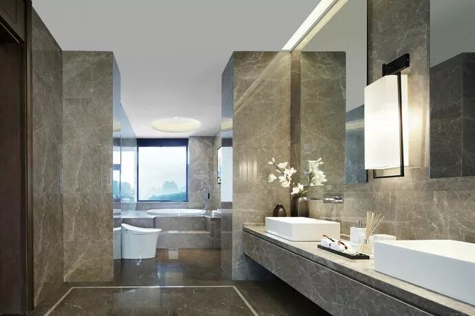 整个卫浴空间的墙面、地面、盥洗台都使用瓷砖装饰,双洗手池更方便了家人的使用,智能马桶和浴缸整齐排列,而窗户上的群山连绵画面给人营造出窗含西岭千秋雪的意境。