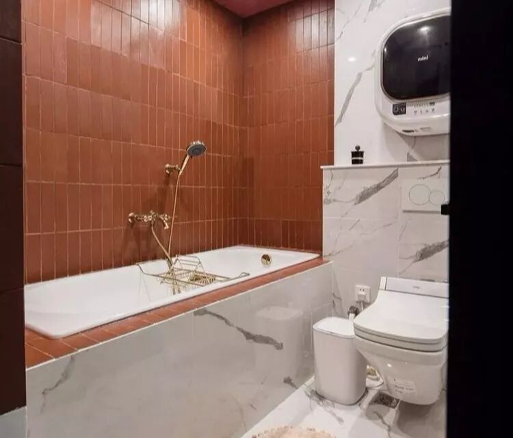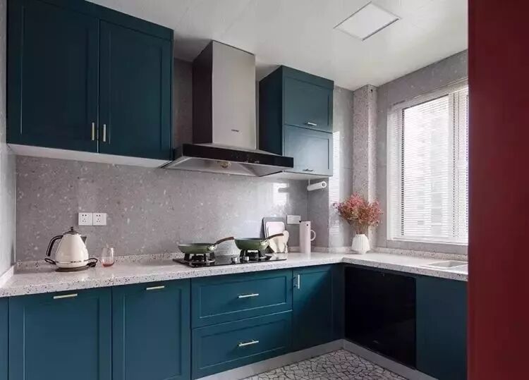 厨卫空间之所以放在一起介绍,是因为三个空间格局相对都比较狭小,而且从三张图片来看,可以感受到整个家里浓烈的撞色。厨房用绀色打造清爽感,主卫用灰绿营造简洁感,次卫则是用了大面积的信号橙打造出活力。