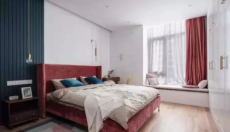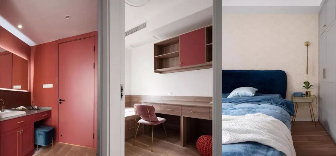 主卧里的丝绒珊瑚红大床和同色系窗帘给休憩蒙上了温暖热情的底色,次卧的深蓝色调又展现出了截然不同的宁静气息。素雅的背景墙和浅色系床品打造出了丰富的层次。白色衣柜上的金色拉手和壁灯形成呼应,显得更加时尚简洁。