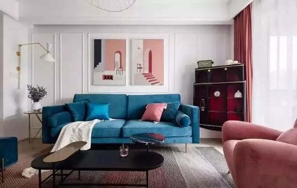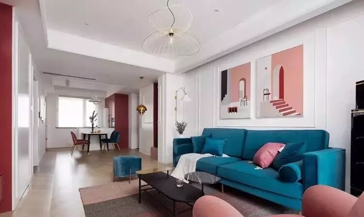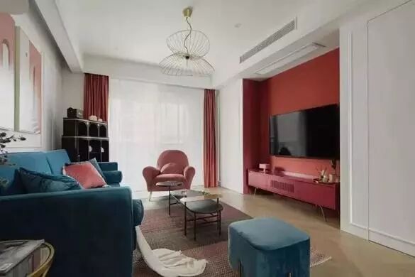 自古红蓝出CP,客厅采用大面积红蓝撞色,但是细看之下,玄关、挂画、电视墙、电视柜、沙发、置物架分别用了不同饱和度的红色,沙发和脚凳的蓝色也不尽相同,不同是色差给了客厅丰富的层次感,也不让人觉得单调突兀。