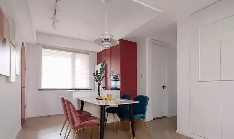 餐厅同样用了红蓝撞色,值得注意的是,旁边顶天立地的柜子不是简单的储物柜,冰箱、烤箱、蒸箱隐匿其中,还有充分的空间放置餐具和杂物。餐桌旁的小吧台既可隔断空间,也是一个小型的西餐料理台,还有一定的收纳功能,餐厅区域佳飞小编给100分。