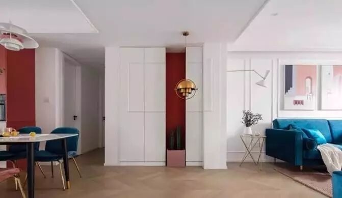 撞色家装中地板不可用深色系,客厅采用鱼骨拼更能拉伸视觉,在整个家装中至关重要。