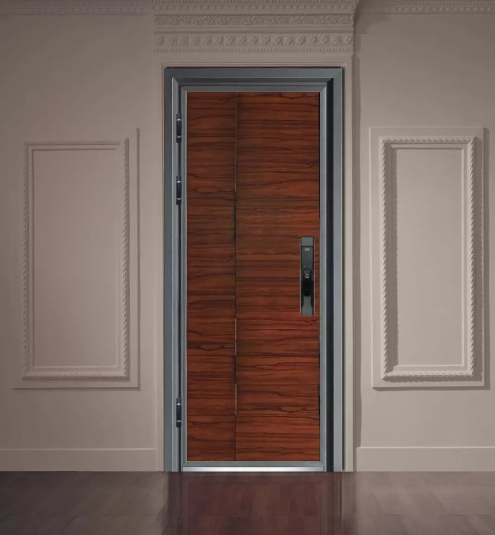 高强度铸铝门面、(外层+内层)防护钢甲板,不锈钢静音锁体,三层防护,强化防盗、防侵蚀、防暴力开启。