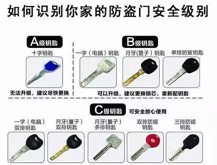 门锁的锁芯等级有ABC三种,A级最次,C级最好。