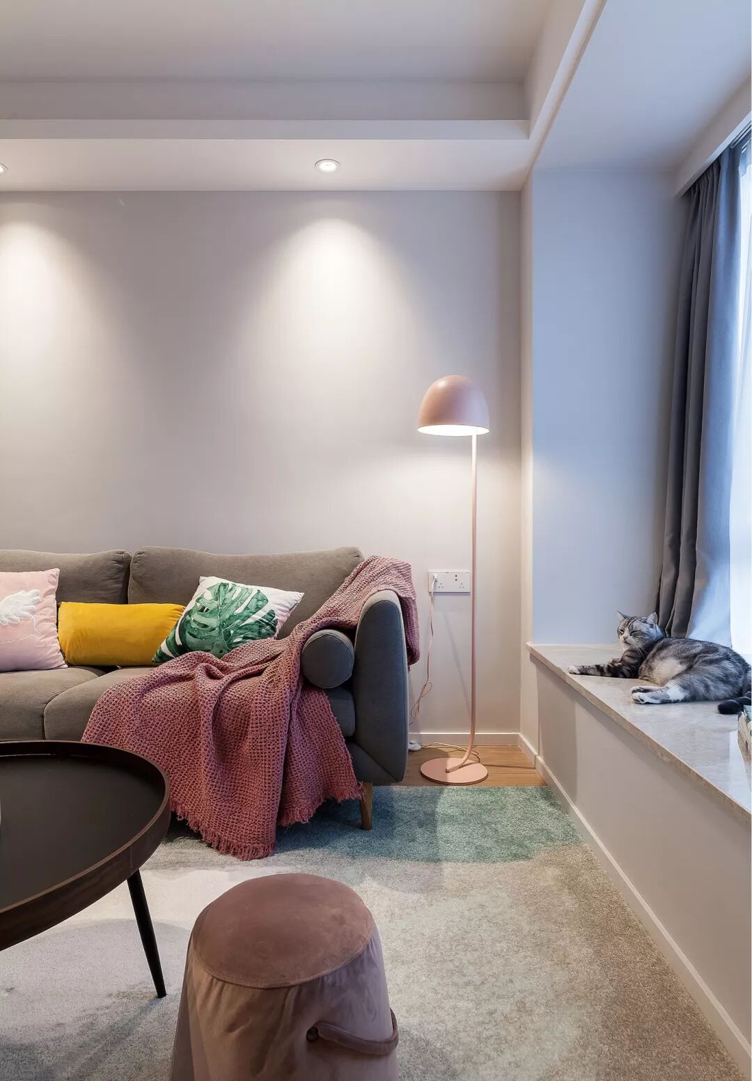 ▲整体浅灰色的空间,简洁的沙发墙上方装上两盏筒灯,结合一张灰色布艺沙发,角落一张淡粉色落地灯,再加上鲜艳活泼的软装细节,营造出一种闲适轻松的年轻氛围感。