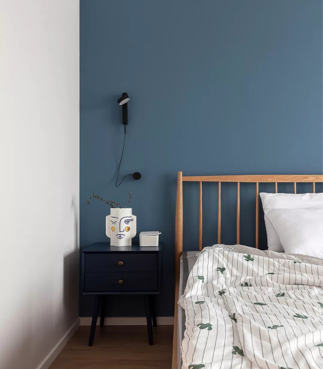 ▲暗蓝色的床头背景,边上黑色的床头柜与壁灯,整体都是显得格外的端庄安静。