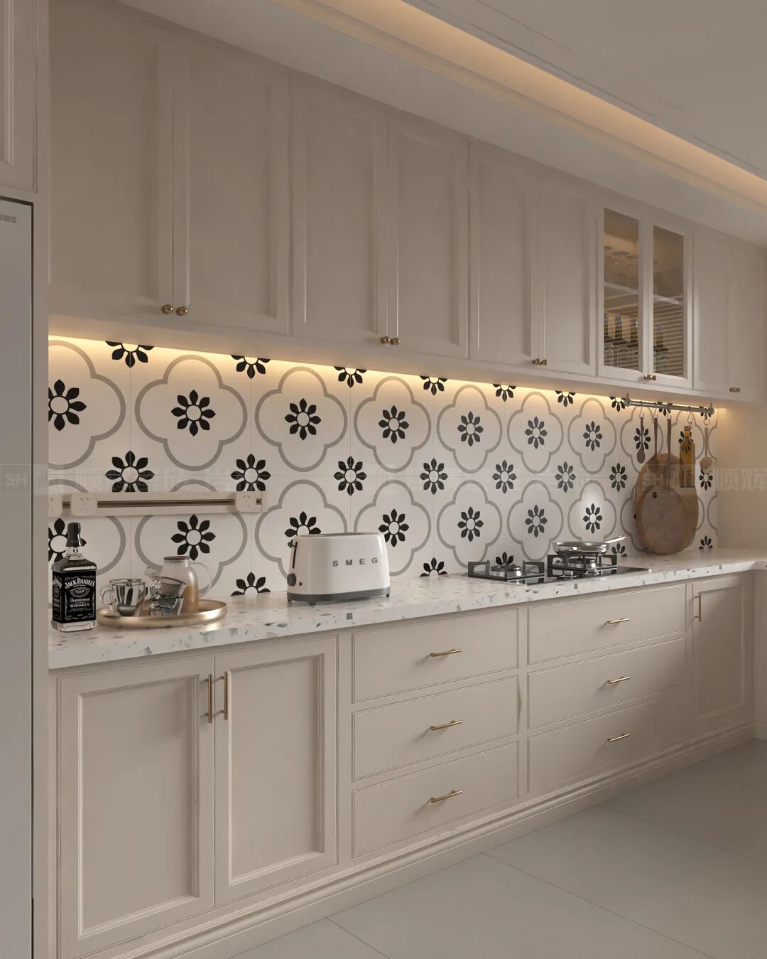 小范围地应用小花砖,不仅能起到美化空间的作用,还能辅助划分更清晰的功能区,比如,厨房的防油污区、卫生间的干湿区、餐厅用餐区、客厅活动区等。